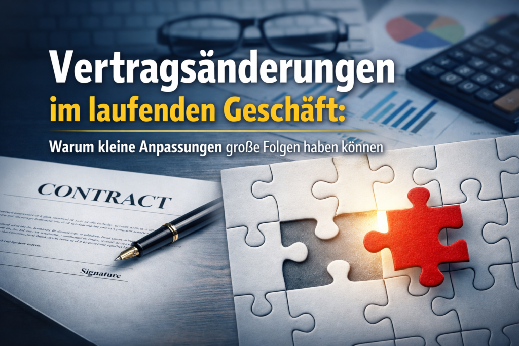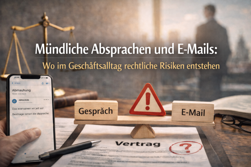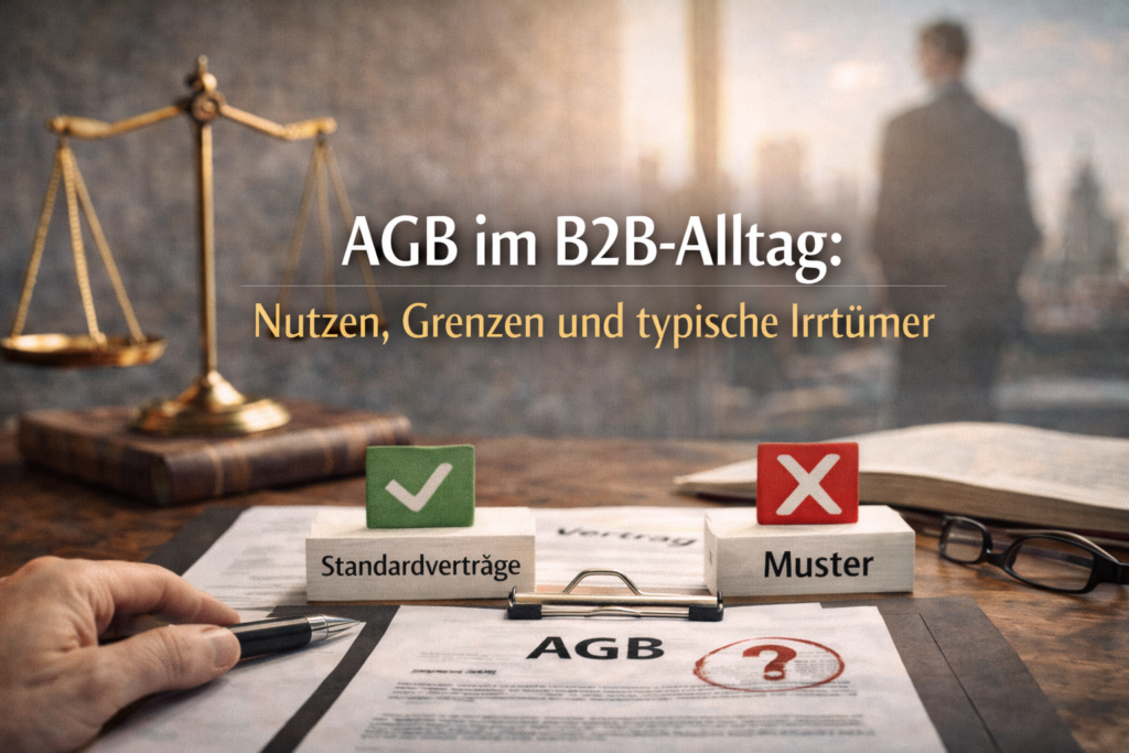 Magazin›VertragsrechtVertragsrechtVertragsrecht strategisch denken: Warum Prävention günstiger ist als StreitVertragsrechtDokumentation und Ablage von Verträgen: Warum Ordnung ein rechtlicher Faktor istVertragsrechtInternationale Verträge und Geschäftspartner: Wo zusätzliche Risiken entstehenVertragsrechtKündigung, Rücktritt, Widerruf: Begriffe, die im Geschäftsalltag oft verwechselt werdenVertragsrechtVertragsänderungen im laufenden Geschäft: Warum kleine Anpassungen große Folgen haben könnenVertragsrechtHaftung im Vertrag: Was Unternehmen oft übersehenVertragsrechtAGB im B2B-Alltag: Nutzen, Grenzen und typische IrrtümerVertragsrechtStandardverträge, Vorlagen, Muster: Wann sie helfen und wann sie gefährlich werdenVertragsrechtMündliche Absprachen und E-Mails: Wo im Geschäftsalltag rechtliche Risiken entstehenVertragsrechtVertragsrecht im Unternehmen: Warum Verträge keine Formsache sind